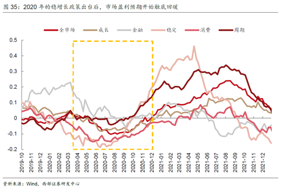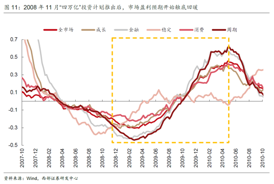 “四万亿”投资谋略推出后,盈利预期开动底部回转。从商场微不雅层面来看,2008年11月“四万亿”投资谋略推出后,分析师对于个股的盈利预期举座开动由负转正,从立场层面来看,周期和金融立场的预期修正幅度最大,体现出商场对于顺周期行业底部回转的乐不雅形态。