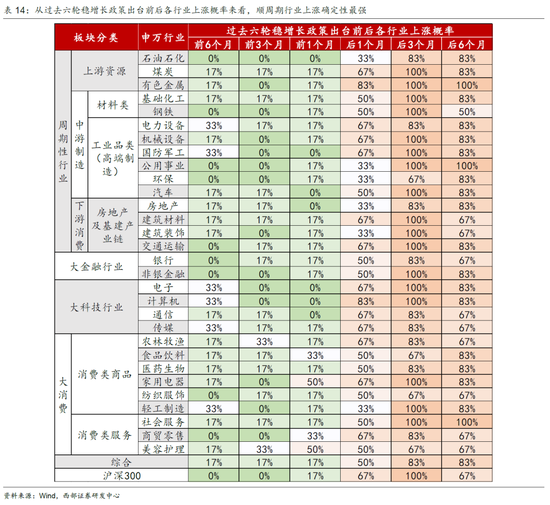 启示四:从上升概率来看,地产链与必选虚耗上升的细目性最强:统计畴昔六轮稳增长计谋出台前后各行业上升概率,不错发现计谋出台后6个月内地产链与必选虚耗板块上升概率开阔接近100%,上升的细目性最强。