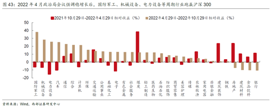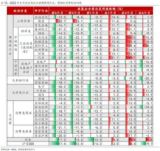 跟着经济复苏由预期转向践诺,周期板块大涨。2022年4月政事局会议强调稳增长后,商场开动有所反应,计谋出台后1个月内,周期板块普涨,跟着稳增长计谋缓缓落地,经济景气度回暖,计谋出台后3个月内,各行业开阔上升,其中周期板块涨幅较大。