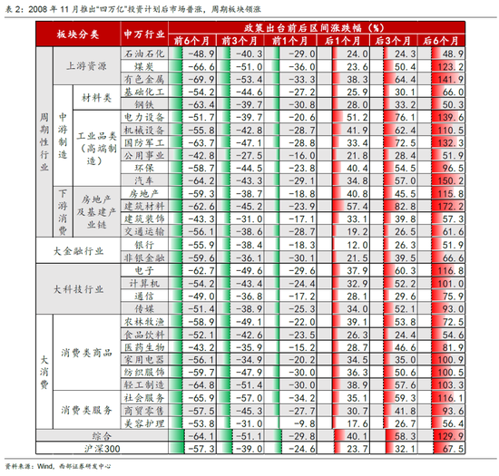 经济复苏由预期转向践诺,推动股市涨幅扩大。2008年11月推出“四万亿”投资谋略后,商场信心受到提振,各行业普涨,跟着稳增长计谋缓缓落地,经济景气度回暖,经济复苏得到考证,各行业涨幅也缓缓扩大,计谋出台后6个月的区间涨幅开阔跳跃50%。其中,周期板块领涨,房地产、建材、有色金属、电力、煤炭等行业涨幅均跳跃100%。