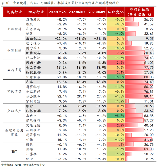 食物饮料、汽车、机械开发等行业盈利预期持续上调,顺周期行业盈利预期仍有较大成立空间。从分析师盈利预测方针来看,虚耗板块的食物饮料、医药生物、纺织服装、汽车等行业畴昔三周的盈利预期持续上调,且预期修正依然达到历史较高水平,顺周期板块的基础化工、机械开发、银行、非银金融的盈利预期也持续上调,然则仍处于历史较低分位,盈利预期仍然有较为彰着的成立空间。