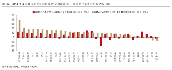 跟着经济复苏由预期转向践诺,股市涨幅陆续扩大。2014年4月政事局会议召开和国常会提倡“定向降准”后,商场并未坐窝作念出反应,计谋出台后1个月内,开阔行业仍然小幅下降,跟着稳增长计谋缓缓落地,经济景气度回暖,经济复苏得到考证,计谋出台后3个月内,顺周期行业开阔开动上升,计谋出台后6个月内,整个行业实现上升,其中,周期板块涨幅较大。