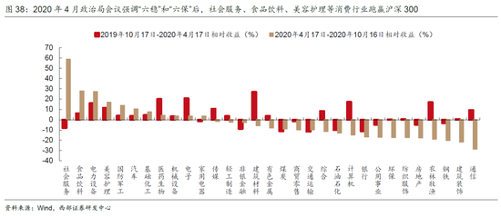 从相对收益角度来看,部分虚耗和周期行业跑赢大盘。以沪深300为基准,对比各行业的相对收益,不错发现,计谋出台后六个月,社会服务、食物饮料、好意思容照看等虚耗行业以及电力开发、国防军工、汽车、化工等顺周期行业跑赢大盘,究其原因,由于2020年头经济受到严重冲击,稳增长计谋同期向虚耗和基建标的发力,因此稳增长计谋带动经济复苏后,虚耗和周期行业相对愈加受益。