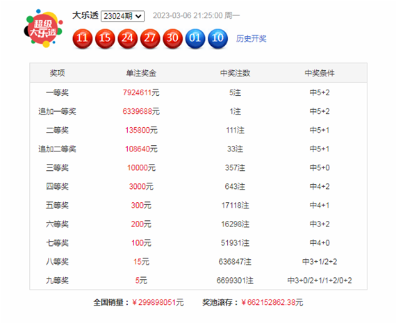 上期开奖:体彩大乐透第2023024期开奖号码为:11 15 24 27 30 + 01 10。